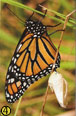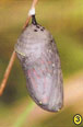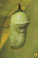 2. A pupa (crisálida) da Monarca. As lagartas se fixam de cabeça para baixo  num ramo conveniente. Elas mudam a casca externa e fiam um casulo,  para se transformar na pupa (crisálida). É aqui que acontece uma  transformação incrível, na qual a maior parte dos tecidos da lagarta se  dissolvem e são transformados numa borboleta – controlado pelo  programa genético do inseto. No início, parece um encerado vaso de  jade.
